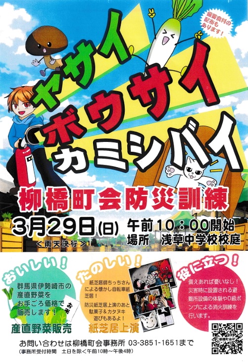 を3月29日(日)に浅草中学校校庭で実施いたします。今回は訓練の他に「防災紙芝居」「産直野菜販売」が開かれます。